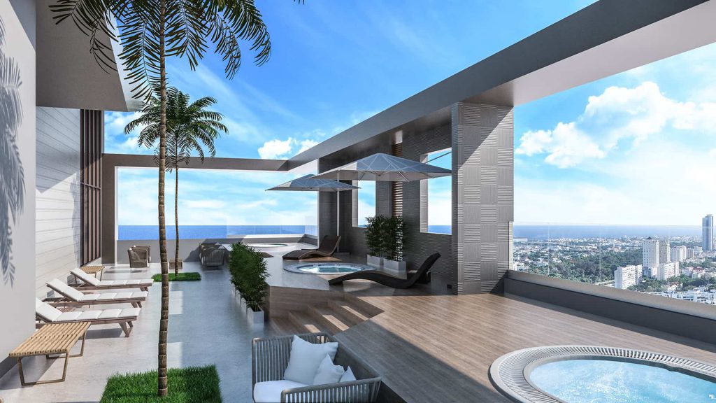 Cuatro ascensores de última generación (dos por cada torre). Amplio lobby amueblado por cada torre. Diseñado y decorado por Diptic Design. Sistemas de cámaras de vigilancia que controlan los accesos, perímetro y zonas comunes del proyecto. Seis Jacuzzis con capacidad para 32 personas en el piso 16, con dos open lounge con BBQ y Bar amueblados para actividades sociales, con las más impresionantes vistas a la ciudad y al Mirador. Gimnasio completamente equipado y diseñado por Body Ignition.Características de los apartamentos