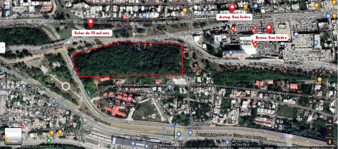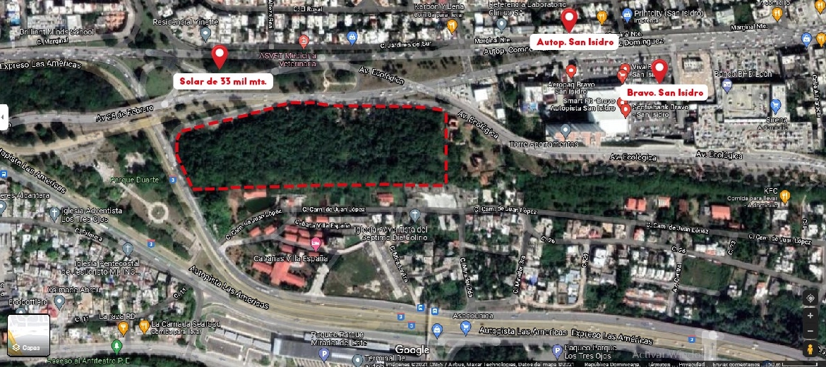 Este solar de 133,000 metros cuadrados se encuentra en una ubicación privilegiada, entre dos áreas de gran demanda: la zona ecológica y San Isidro, uno de los sectores más exclusivos de la ciudad. Su ubicación es ideal para desarrollar proyectos residenciales, comerciales o mixtos, gracias a la accesibilidad y proximidad a vías principales como la Avenida Ecológica.