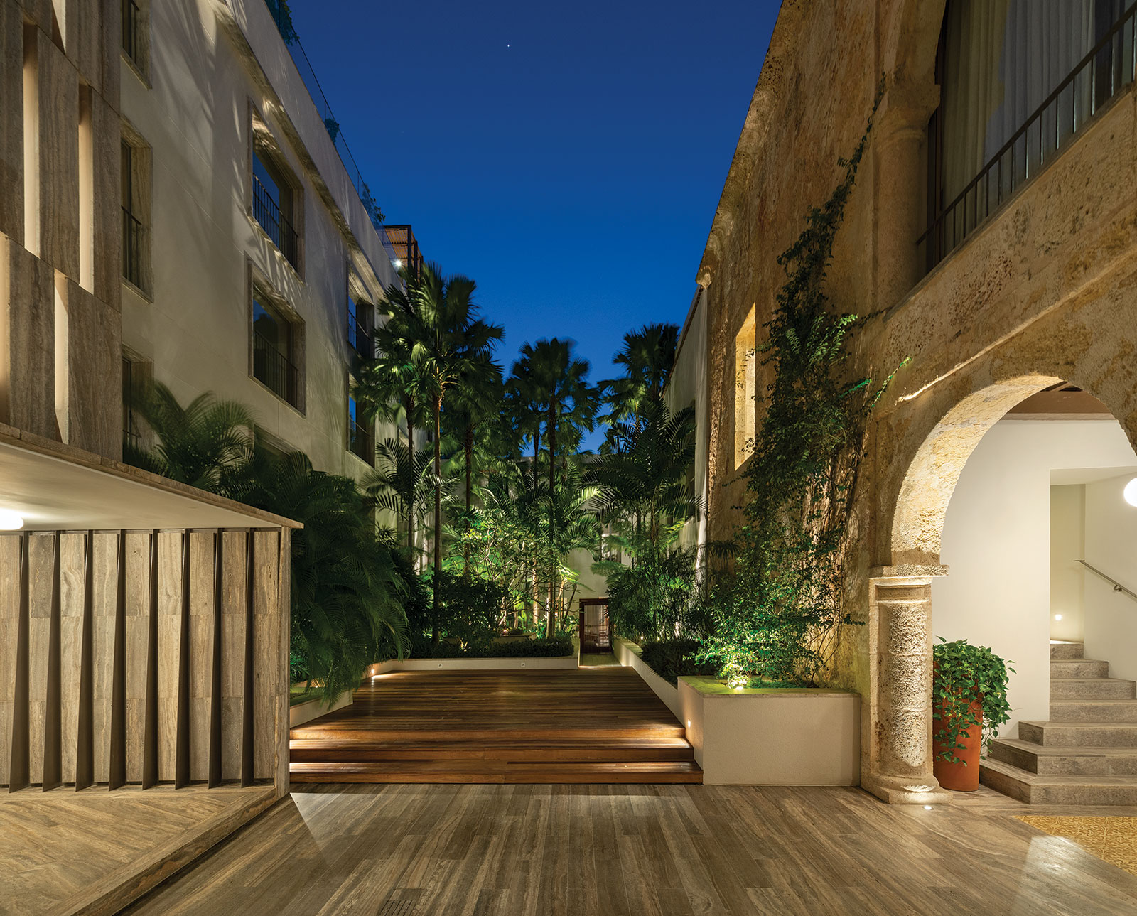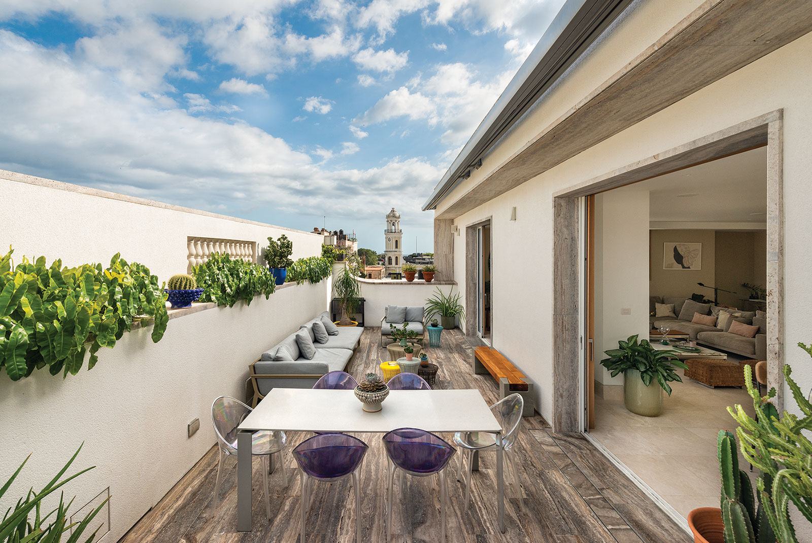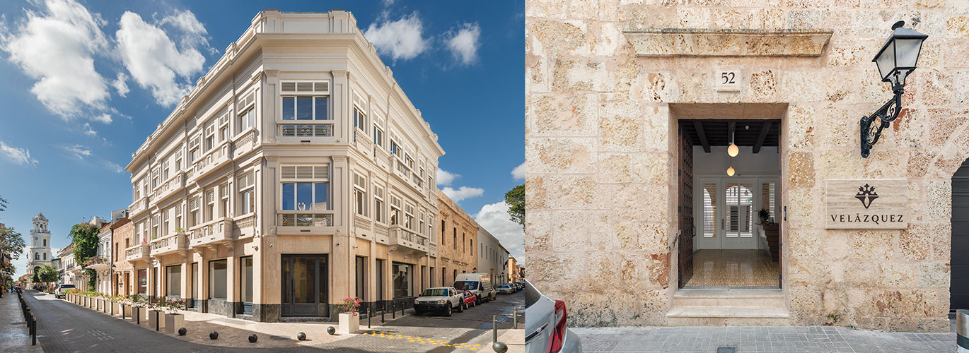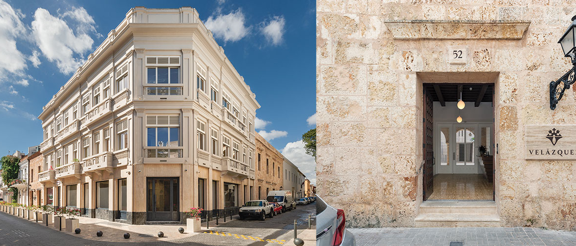 El edificio de Casa Velázquez, ubicado sobre la esquina de las calles Arzobispo Meriño y Luperón, contó con un cuidadoso y largo proceso de trabajo de restauración. Se trata de un conjunto de cuatro inmuebles de valor patrimonial en el que se conserva y pone en valor la fachada y se interviene el interior de manera contemporánea, con un respetuoso y exquisito diseño, para lograr un conjunto de lujosos apartamentos en pleno corazón de la Ciudad Colonial de Santo Domingo.