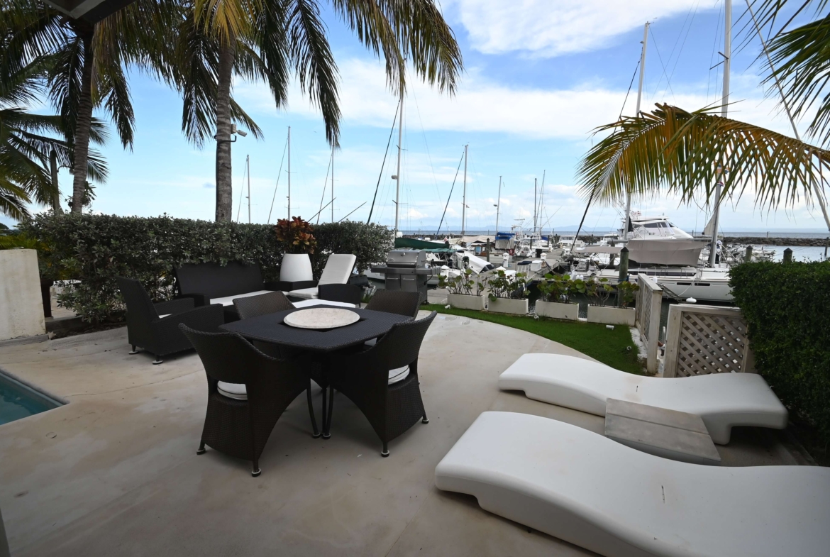 Vendo Villa en Samaná en el residencial Puerto Bahía, esta magnífica propiedad está ubicada frente a la marina del proyecto, por lo que tiene muelle propio para una embarcación o lancha de hasta 50 pies.