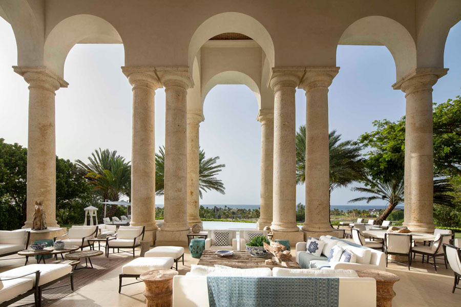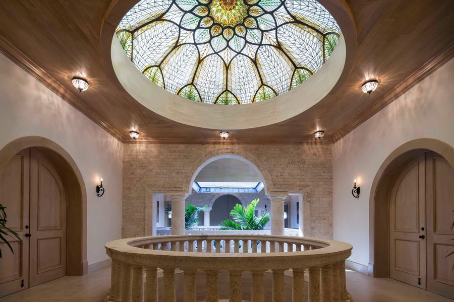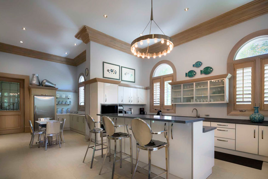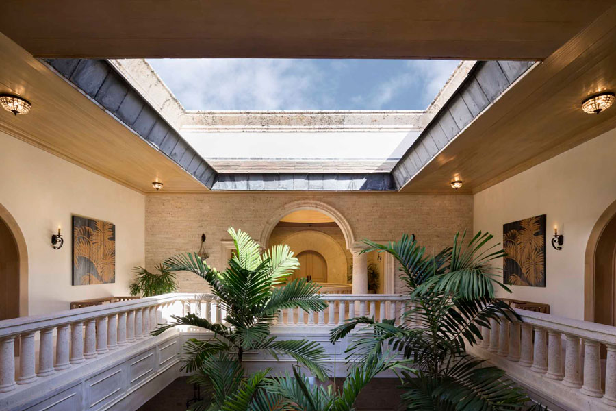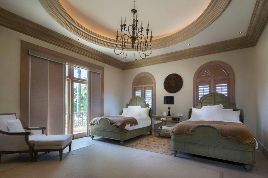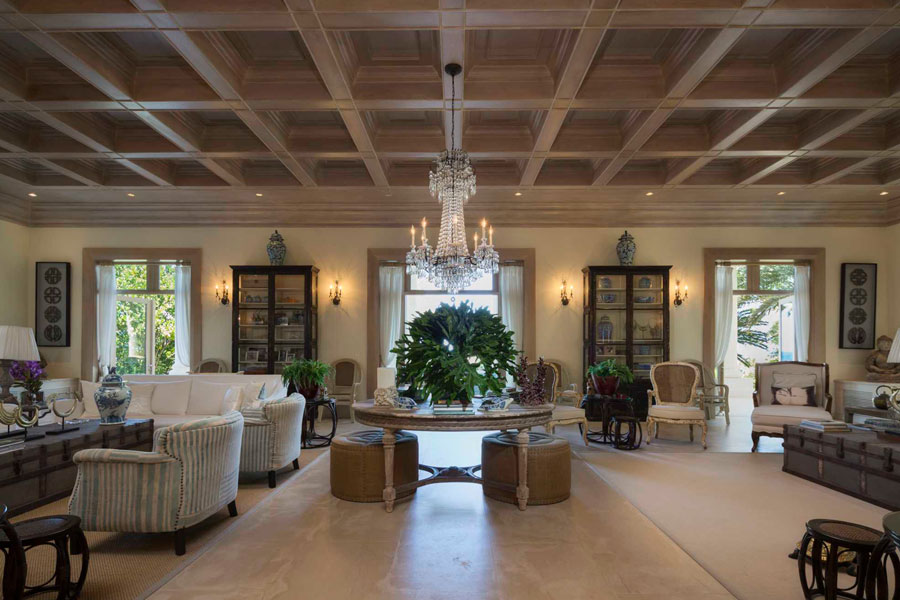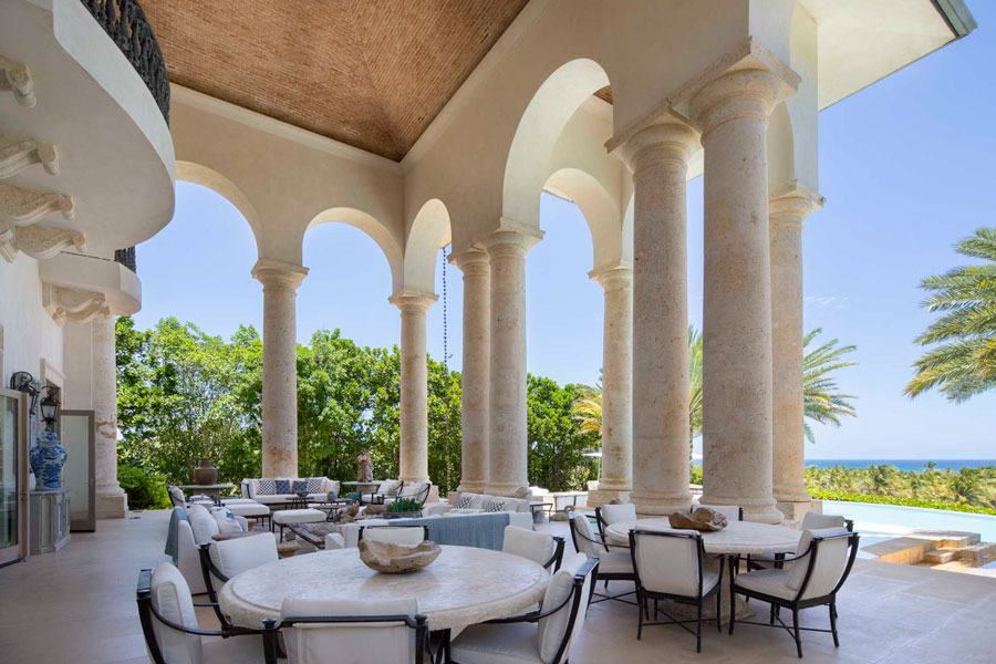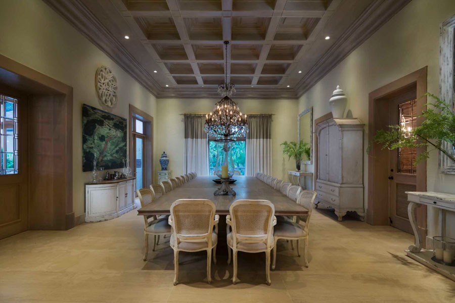 Los alrededores de la villa pueden ser exuberantes y tropicales, pero como su nombre lo indica, sus interiores tienen estilo italiano elegancia. Dos hermosos patios interiores, uno de los cuales está coronado por una cúpula de vitrales, traen para recordar los conservatorios de las grandes propiedades europeas. El gran salón cuenta con artesonado techos, tonos neutros y dos salas de estar majestuosas pero cómodas, y el sereno comedor tiene capacidad para 24 invitados con facilidad. En la cocina totalmente equipada, gabinetes blancos, encimeras de piedra y un la barra de desayuno es luminosa y acogedora.